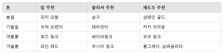 색조 화장은 단순히 예쁜 컬러를 선택하는 것이 아니라, 자신의 피부톤을 이해하고 조화롭게 연출하는 과정입니다. 피부톤에 맞는 색조를 고르면 얼굴이 더 화사해 보이고, 전체적인 스타일 완성도도 높아져요. 오늘 알려드린 팁을 참고해, 나만의 퍼스널 컬러를 찾아보세요. 어울리는 색 하나로도 인상이 달라질 수 있답니다.